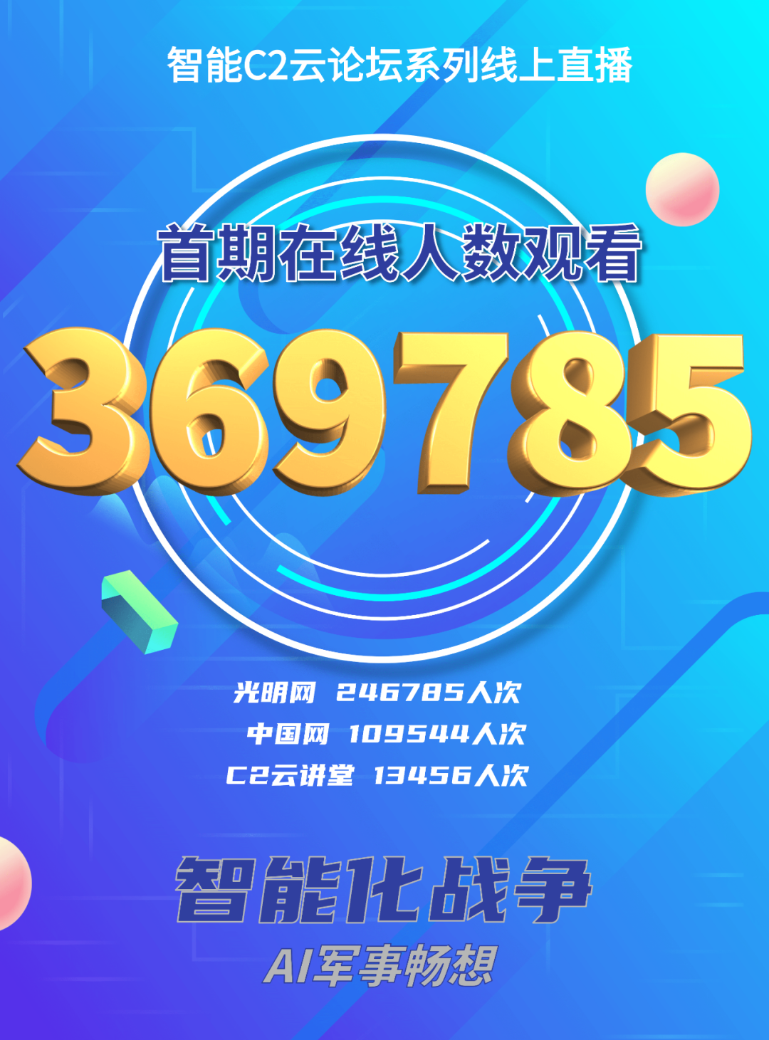 6月6日,由中国指挥与控制学会和国防工业出版社共同主办,光明网和洞见未来承办的智能C2云讲堂——第一期“军事智能化”正式开播,第一期主题为“智能化战争——AI军事畅想”,本次直播通过CICC云课堂、光明网和中国网同步在线直播,累计在线观看369785人次。