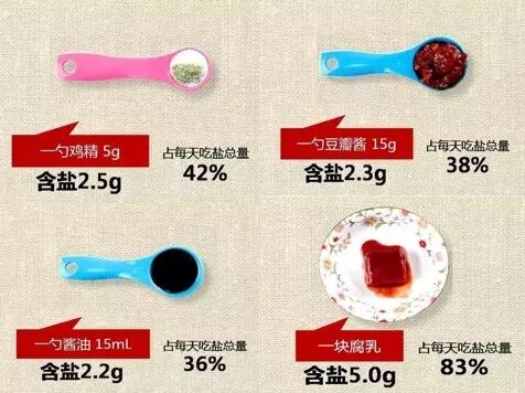 限盐不仅仅是控制少放盐,还要限制富含“隐形盐”的食物的摄入,除了众所周知的酱菜、咸菜、咸肉和咸鱼等,还有很多,例如:15ml酱油就有2.2g盐,15g豆瓣酱中含2.3g盐,一小袋榨菜15克大约有1.6g盐,20g一块的豆腐乳有5g盐,100g挂面含1200mg钠,还有鸡精、味精、醋都含有盐。另外零食如薯片、苏打饼干、蜜饯、方便面中含盐量也很高,特别是话梅100g就含有钠2800mg。因此如果我们膳食中如果食用了含“隐形盐”的食物,也要计入一天摄钠量的计算中,更需要减少食盐的使用量了,尤其是经常喜欢加酱油、生抽、豆瓣酱做饭的人。