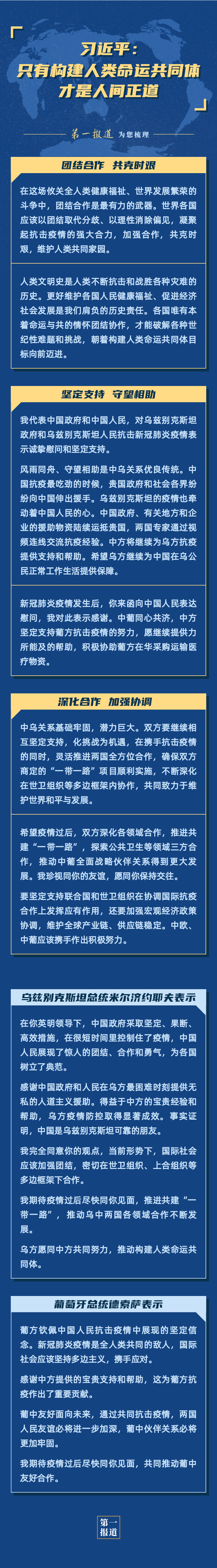 习近平指出,人类文明史是人类不断抗击和战胜各种灾难的历史。更好维护各国人民健康福祉、促进经济社会发展是我们肩负的历史责任。各国唯有本着命运与共的情怀团结协作,才能破解各种世纪性难题和挑战,朝着构建人类命运共同体目标向前迈进。要坚定支持联合国和世卫组织在协调国际抗疫合作上发挥应有作用,还要加强宏观经济政策协调,维护全球产业链、供应链稳定。中欧、中葡应该携手作出积极努力。